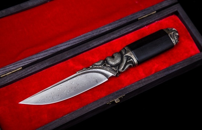 Авторский нож «Питон» (нержавеющий дамаск, черное дерево, благородный металл, клык моржа)
