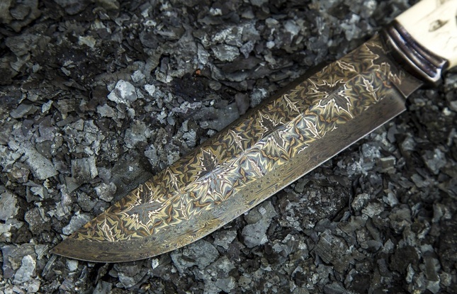 Авторский нож «Скорпион» (мозаичный дамаск с никелем, рукоять клык моржа, больстер мозайка) художественное оформление рукояти "скримшоу"